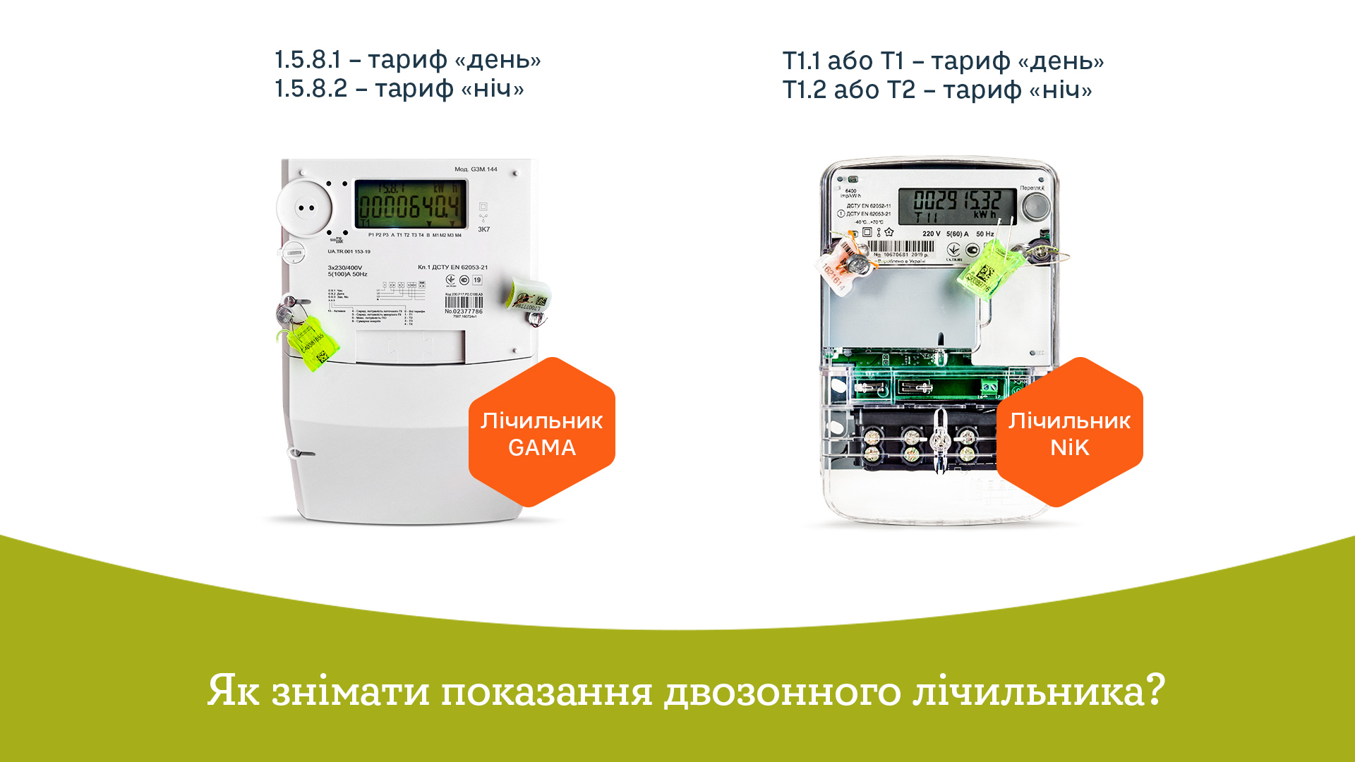 У склад енергоефективних наборів від YASNO можуть входити електролічильники двох різних марок. Так, на лічильниках GAMA індекс «1.5.8.1» вказує на тариф «день», а індекс «1.5.8.2» - на тарифну зону «ніч». А в залежності від типу лічильників NiK електроенергія за тарифом «день» має індекс «Т1.1» або просто «Т1», а за тарифом «ніч» - «Т1.2» або «Т2».