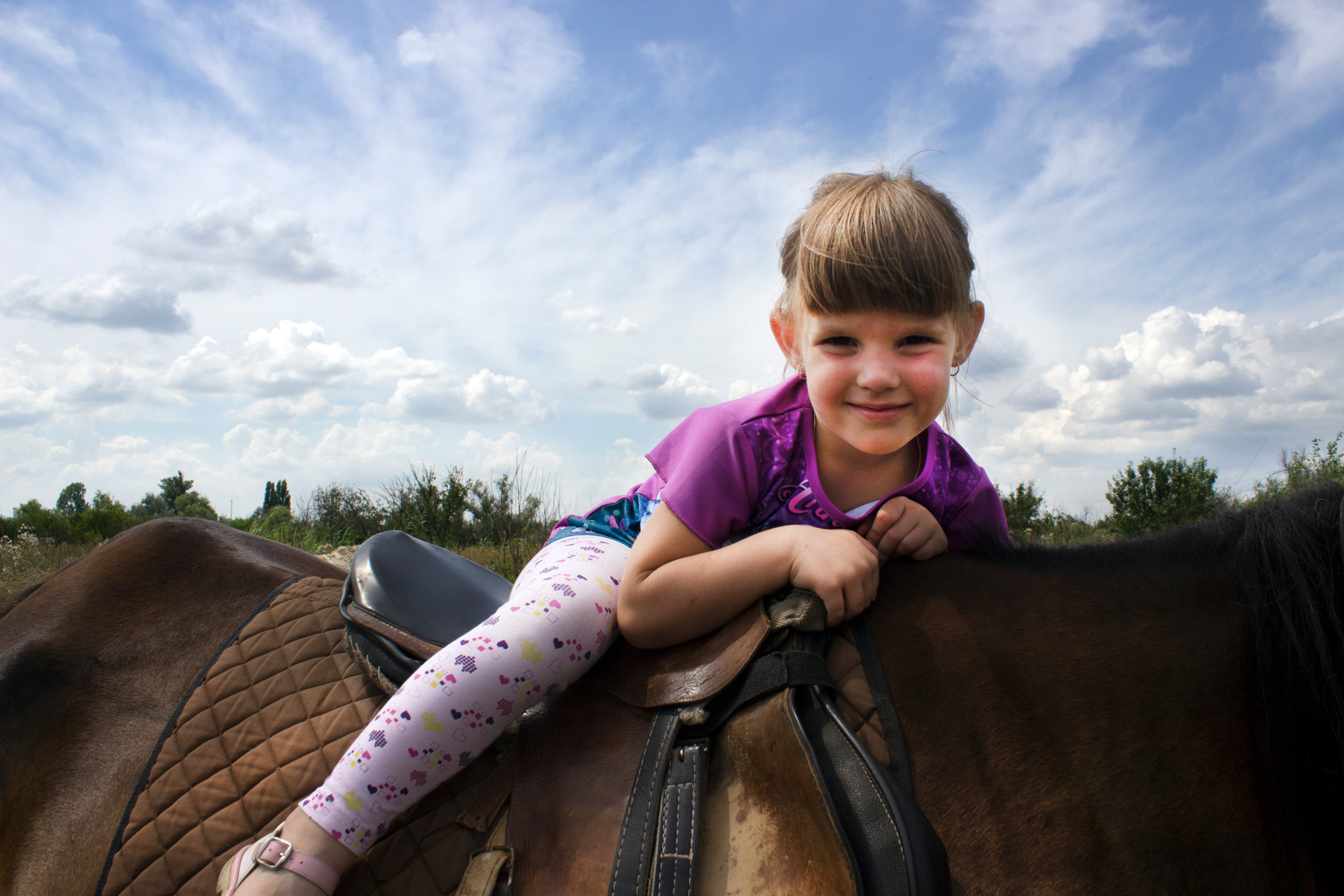 Действительно, даже со стороны видно, что от лошадей ребенок просто без ума, с радостью и без страха садится на свою "Макизю" (так девочка называет лошадку "Маркизу"), уверенно держится верхом и готова кататься до бесконечности.