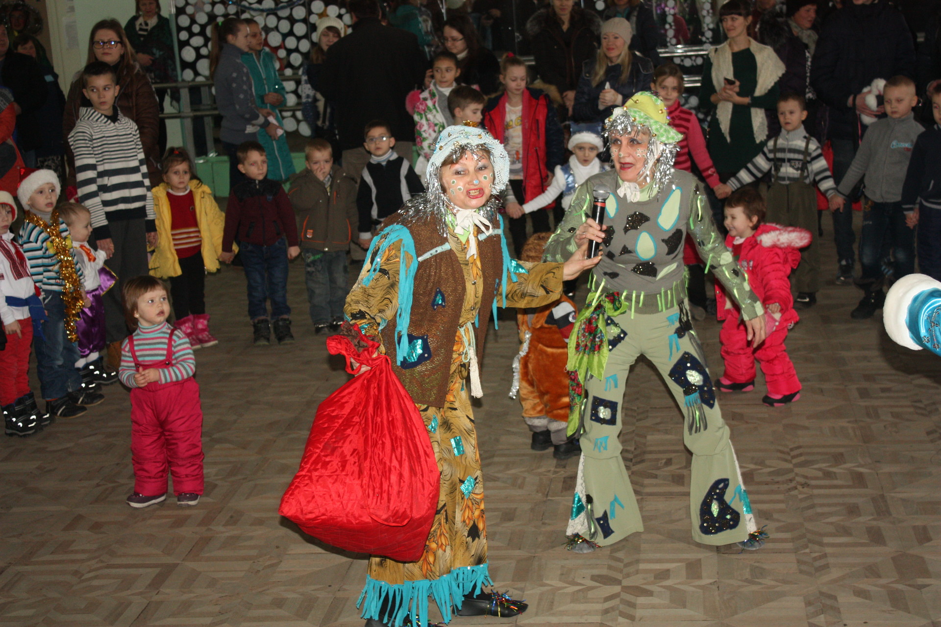 Актеры и зрители переместились в соседний зал, к новогодней елочке, где Сырость и Мокрота снова попытались строить свои злобные козни. Но новогодняя магия способна перевоспитать даже самых отрицательных персонажей. И вот уже бывшие злодеи вместе с Дедом Морозом, Снегурочкой и маленькими гостями праздника водят хороводы, танцуют и проводят конкурсы. А в завершение мероприятия дети получили небольшие подарки от профкома ОГОКа.