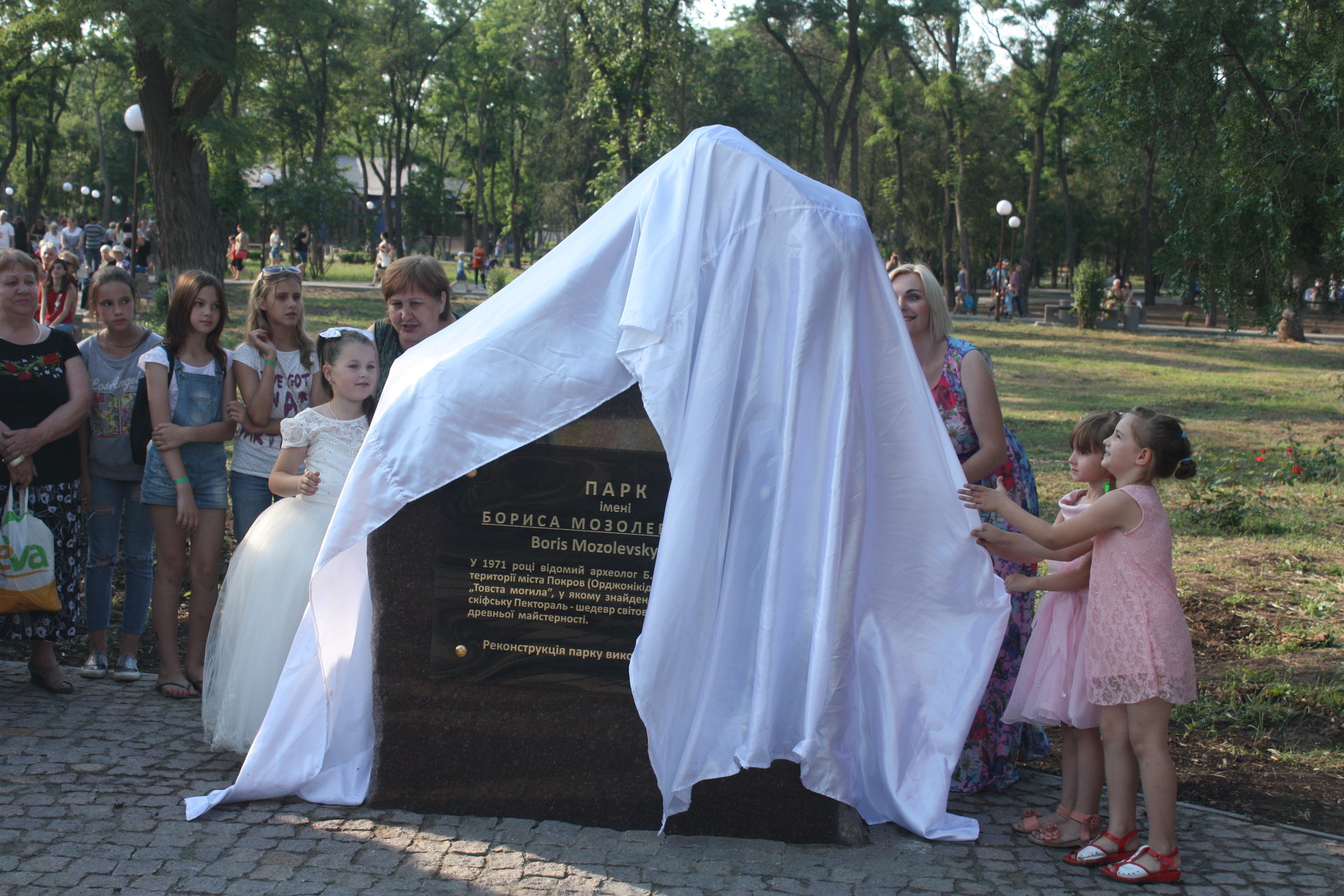 Почетное право открыть памятный знак Борису Мозолевскому было предоставлено самым маленьким жителям города. А благочинный Покровского благочиния отец Владимир освятил эту гранитную стелу и сам парк, а также пожелал всем жителям города счастья, благополучия и божьего благословения.