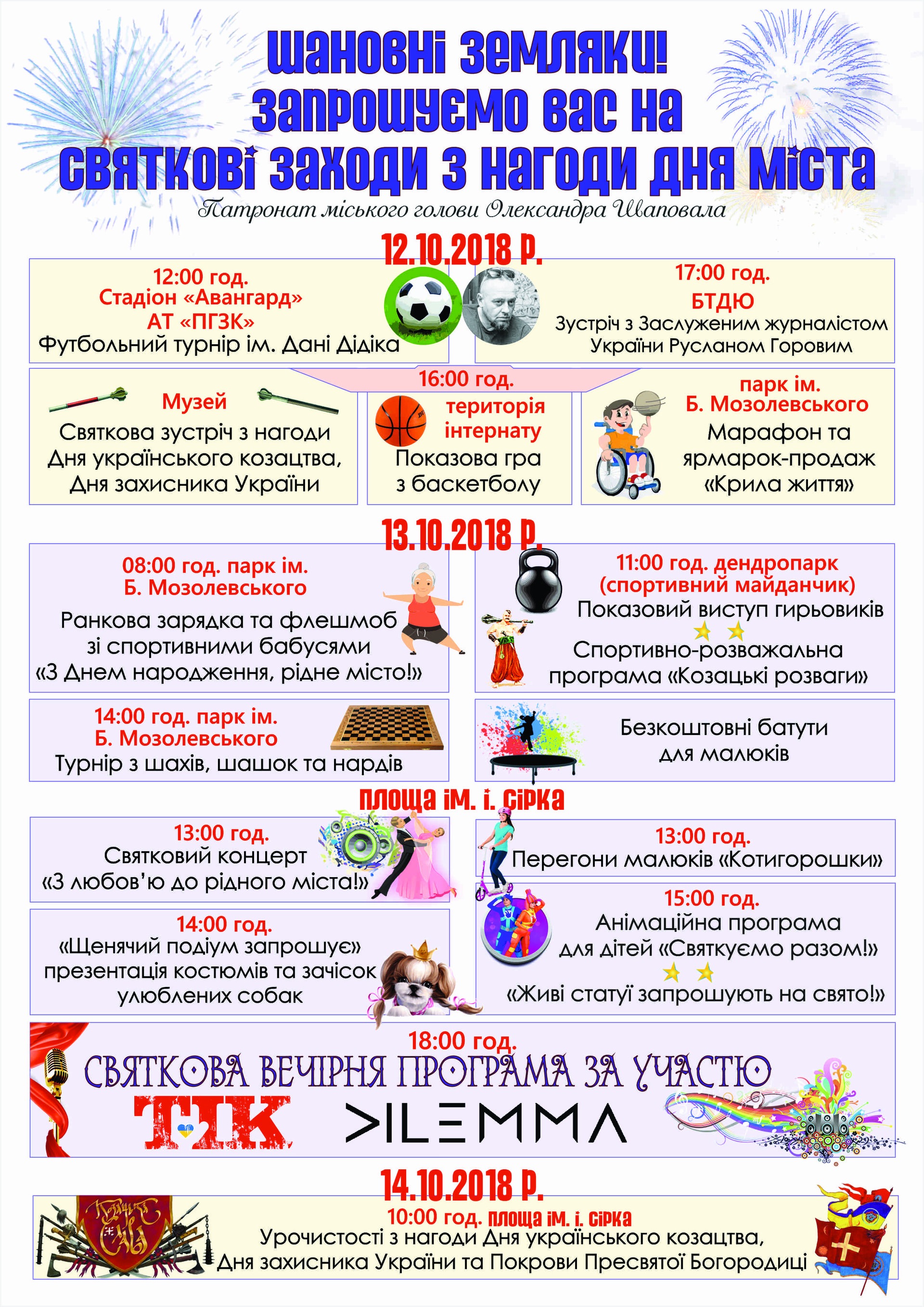 Начнутся праздничные мероприятия еще с пятницы, 12 октября. На 12 часов дня запланирован футбольный турнир им.Дани Дидика, который состоится на стадионе "Авангард". Также в пятницу в городском народно-историческом музее им.А.Н.Занудька пройдет праздничная встреча ко Дню украинского казачества, а также Дню защитника Украины. После футбольного турнира любители спорта смогут посетить показательные выступления по баскетболу, которые запланированы на 16 часов на территории бывшего интерната. В это же время в парке им. Мозолевского состоится ярмарка-продажа изделий прикладного искусства и марафон "Крылья жизни". Завершится первый праздничный день в Доме творчества детей и юношества, где в 17 часов пройдет встреча с Заслуженным журналистом Украины Русланом Горовым, который, кстати, уже приезжал в Покров. О встрече с ним мы писали в материале http://novemisto.info/v-pokrove-projdet-prezentaciya-knigi-ruslana-gorovogo/