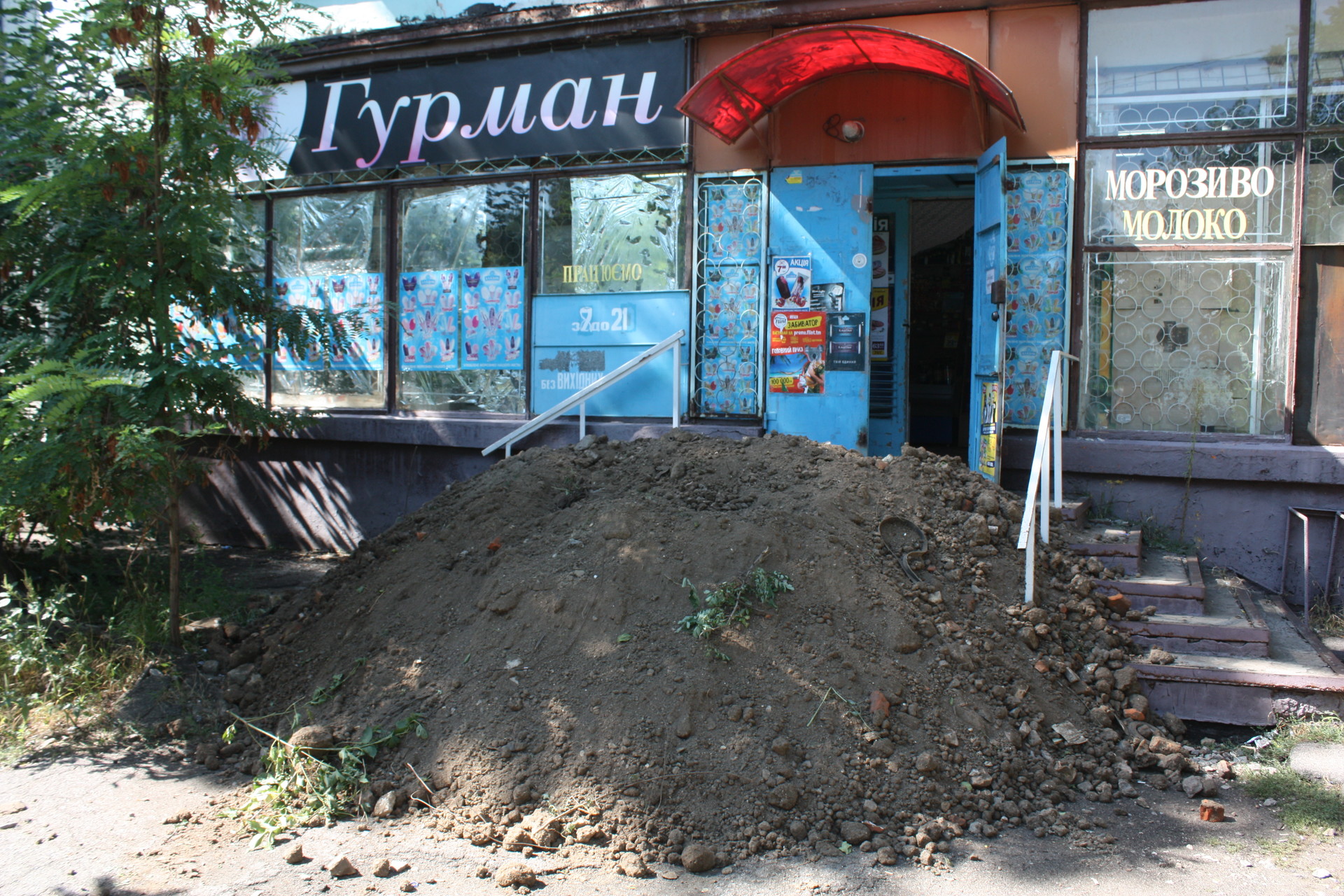 Однако на этом история не закончилась. Утром 13 сентября вход в магазин "Гурман", где также одним из арендаторов является Станислав Новицкий, оказался засыпан землей и строительным мусором! Это произошло накануне вечером, через 10 минут после закрытия торговой точки. И процедура также повторилась: из темной иномарки вышли двое человек, указали, как надо высыпать землю, сфотографировали и также спешно удалились. А утром, для контроля о своей проделанной грязной работе, подъехали, посмотрели, как продавец будет входить в магазин, и уехали. Пока насыпи мусора не убрали, пробраться в магазин можно было только по узкому проходу вдоль стены здания. Покупатели, среди которых немало пожилых людей, не стеснялись в "лестных" эпитетах для тех, кто обрек их на такие неудобства.