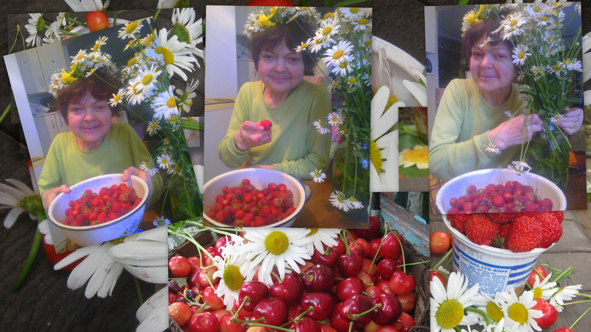 Розбираю щедрий кошик: маленька гілочка черешні з ягодами, гілочки м’яти цілющої, духмяна гірська лаванда… І дуже тендітний віночок із ромашок. Мої улюблені квіточки! І ягоди… Дивно… в такі хвилини здається, що і біль відступає, а серце співає, і слова самі від душі ллються, слова-рядочки: