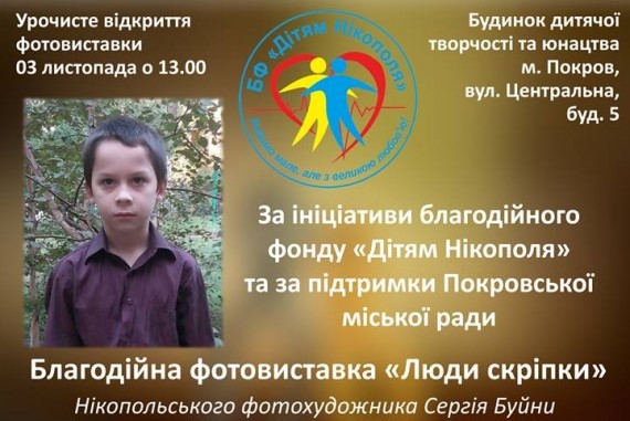 З 3 по 18 листопада в покровському Будинку творчості дітей та юнацтва проходитиме благодійна фотовиставка нікопольського фотохудожника Сергія Буйни – "Люди скріпки". Її урочисте відкриття відбудеться 3 листопада о 13.00.
