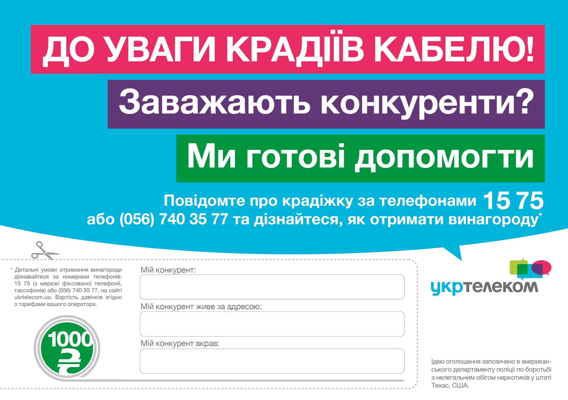 Чтобы дополнительно привлечь внимание к кражам кабеля, были разработаны специальные листовки с призывом "Мешают конкуренты? – Мы готовы помочь!". Идею объявления, обращенного к ворам меди, в "Укртелекоме" позаимствовали у департамента по борьбе с нелегальным оборотом наркотиков полиции штата Техас, США.